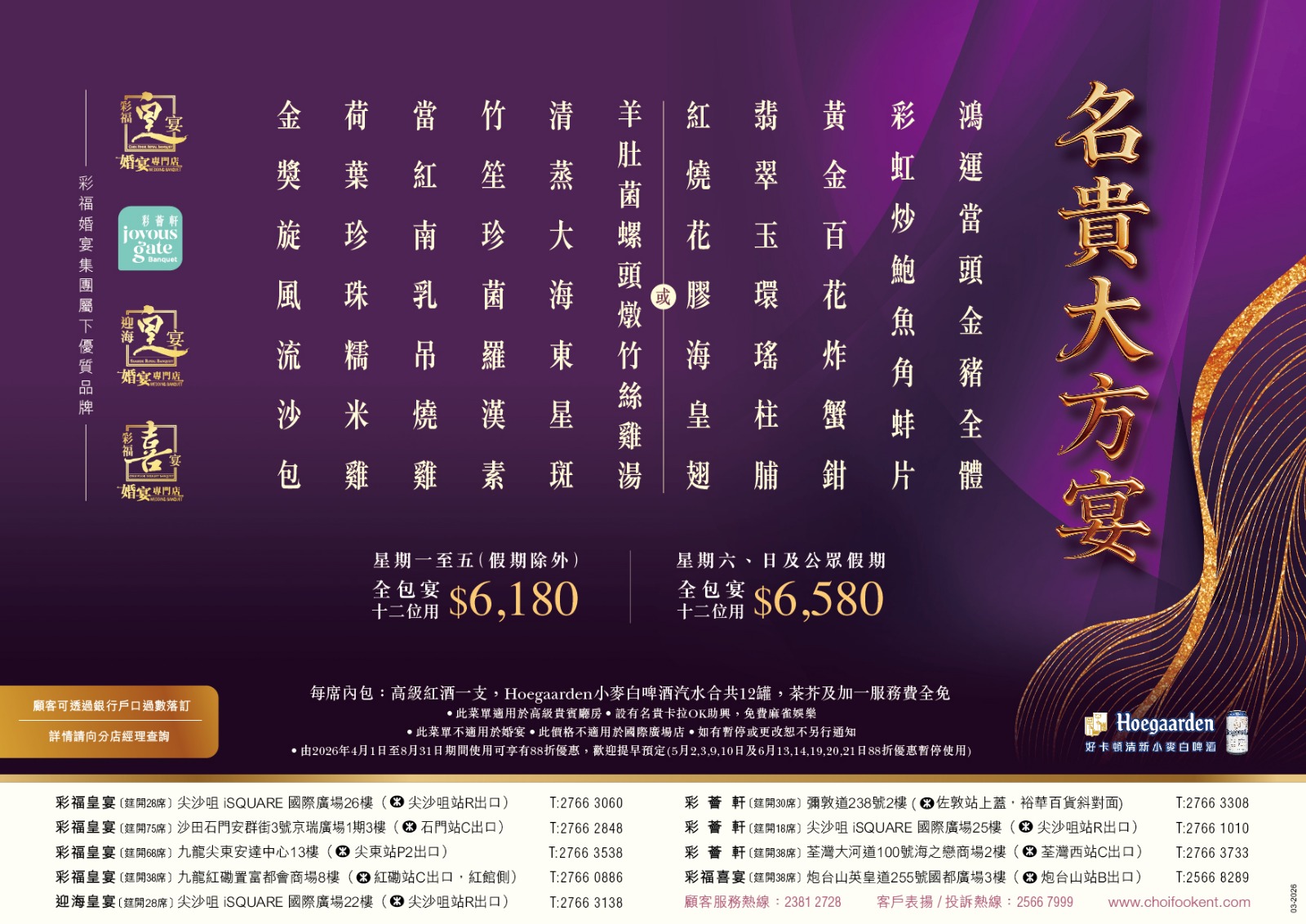 名貴大方宴現己上市,歡迎與各分店查詢及預約訂座。
