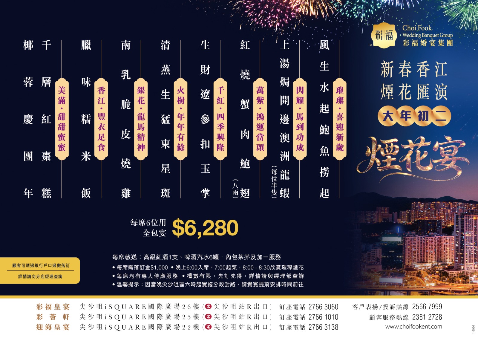 「新春豐裕宴」、「新春豐盛宴」 此菜單由2026年2月7日至3月1日供應,以上套餐只適用於晚飯散座。 凡於2026年3月1日前預訂,每席送彩福$100現金券2張(以落訂金為實) 歡迎致電與分店同事預約訂座及落訂。 詳情可向各分店查詢。備註:iSQUARE國際廣場套餐價錢略有不同