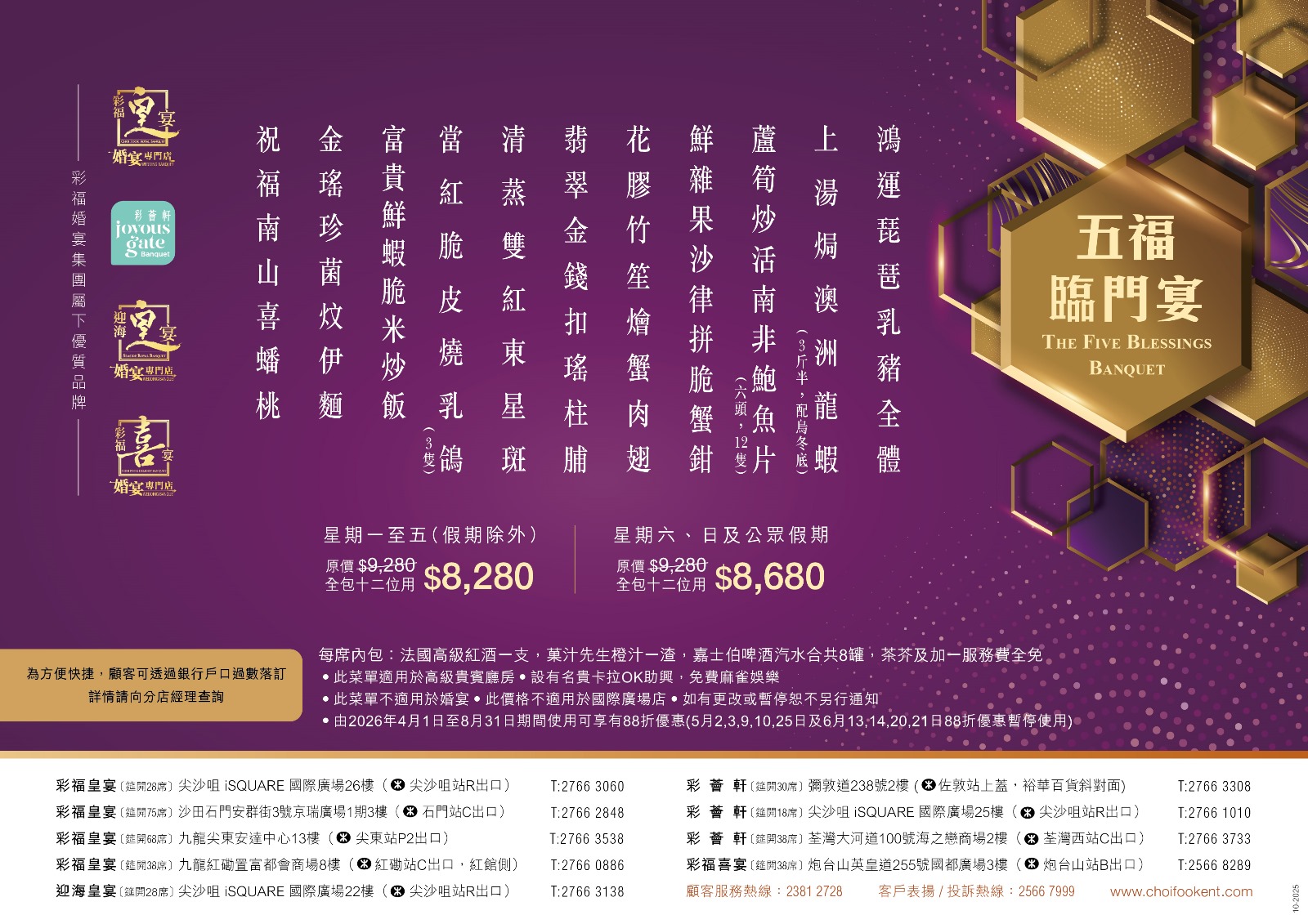 「五福臨門宴」於2025年10月10日起正式上市,歡迎致電落訂預約。