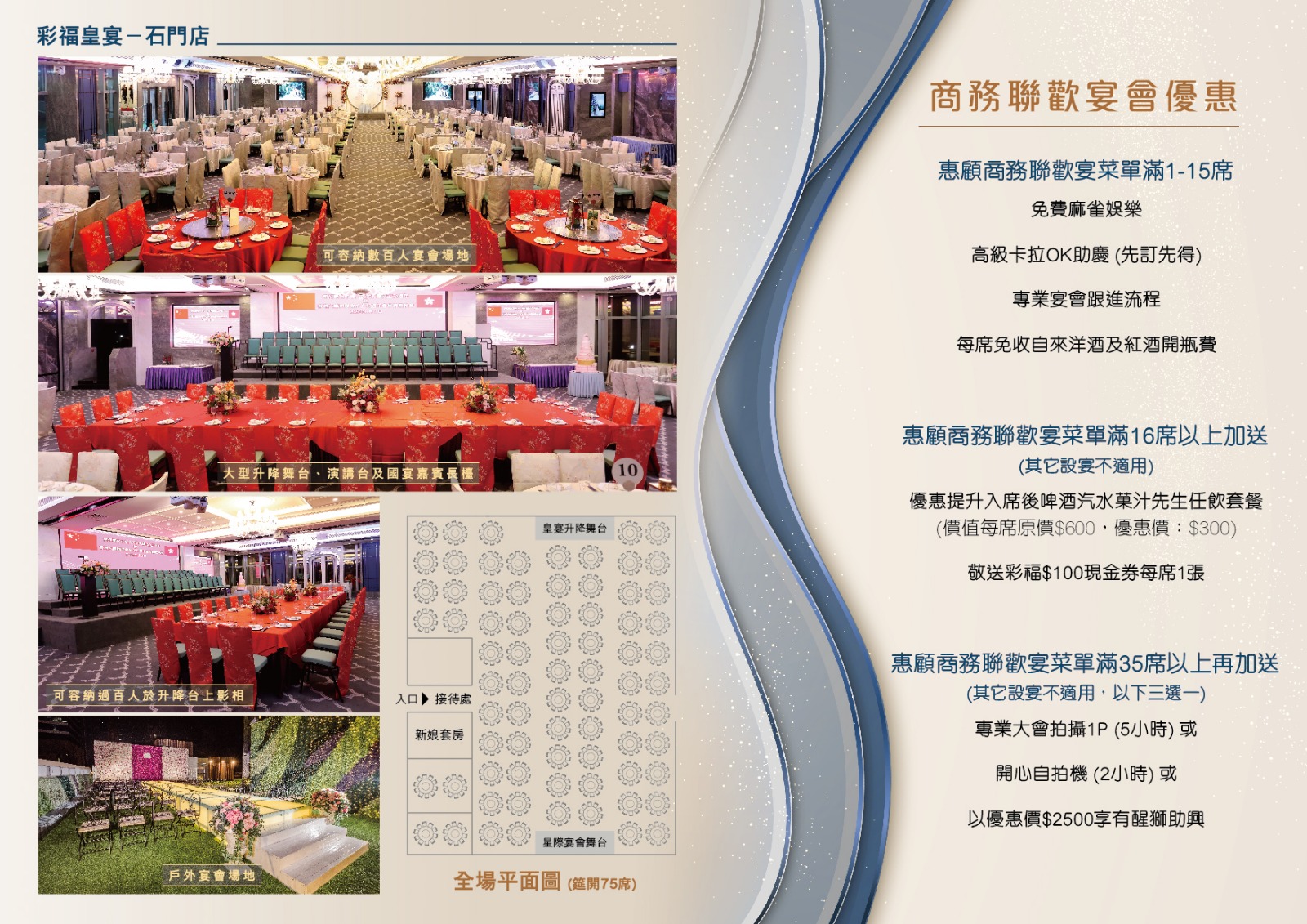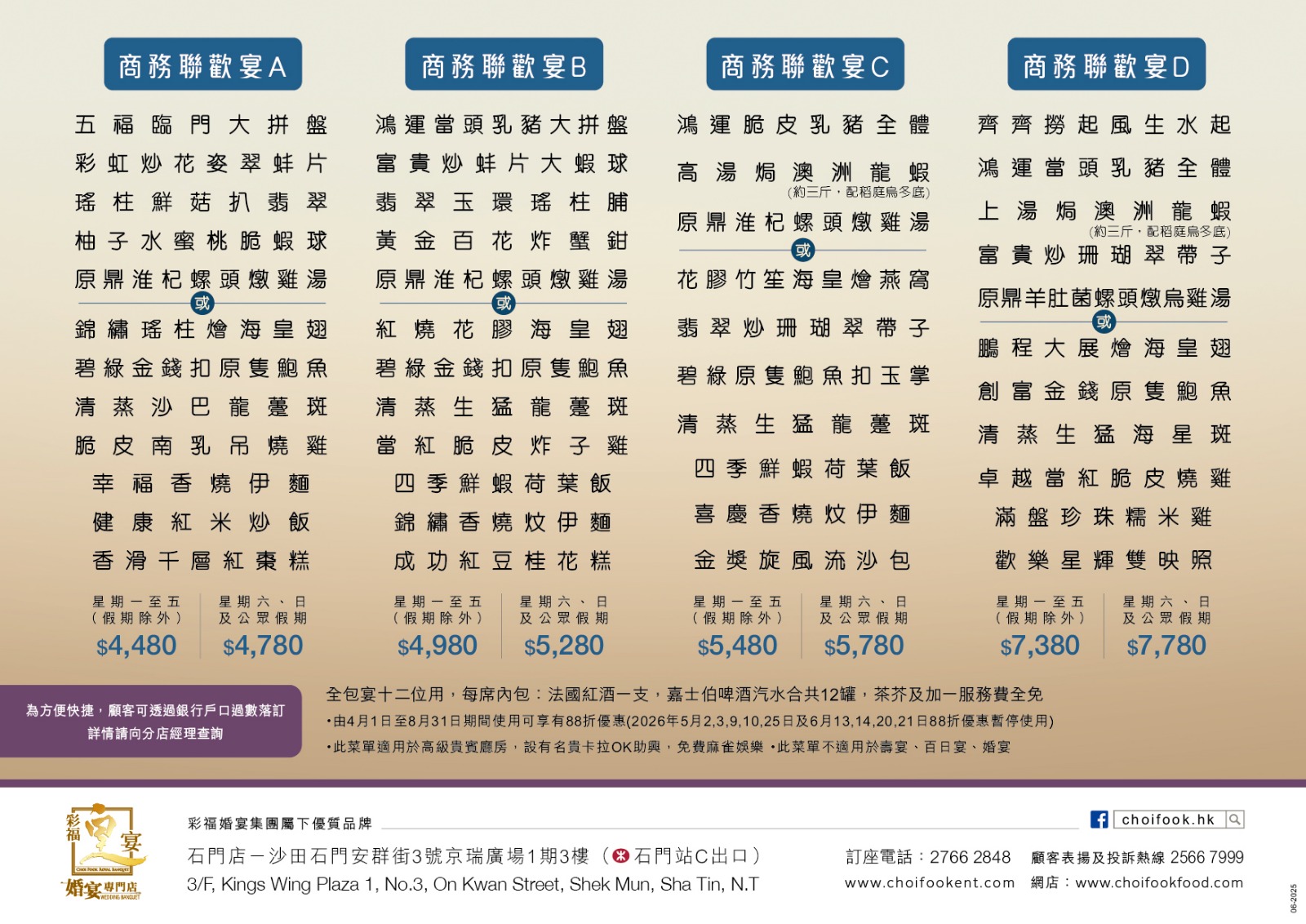 彩福全新商務聯歡宴會菜單現已上市,歡迎與分店宴會經理查詢詳情。
