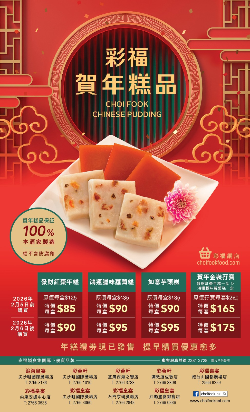 彩福鮑魚盆菜 現正發售分別「4位用」、「8位用」及「12位用」盆菜禮券,可向各分店查詢及購買禮券。 領取日期: 2025年12月12日至2026年1月1日及2026年2月13日至3月8日 每日新鮮製作 下午2:30後取貨(須提前一天預訂)