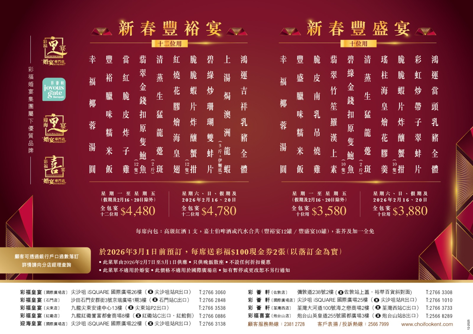 凡於2026年3月1日前預訂,每席送彩福$100現金券2張(以落訂金為實)